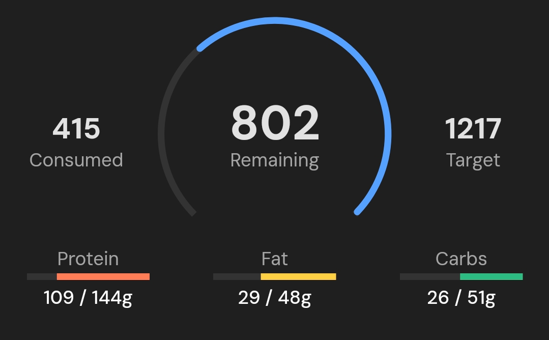 That's worked really well so far, and I'm managing about 1.75kg/week on my current plan. I am struggling to hit my protein goal, though - the app also gives you macronutrient breakdowns and targets (hence the name). But it is right that I should be having more given my exercise. It feels a bit odd - on longer days I tried not to eat any more - but after a few weeks it's arrived at a reasonably sensible daily goal (1270 on "rest" days, 1350 on "workout" days), which I mostly hit.